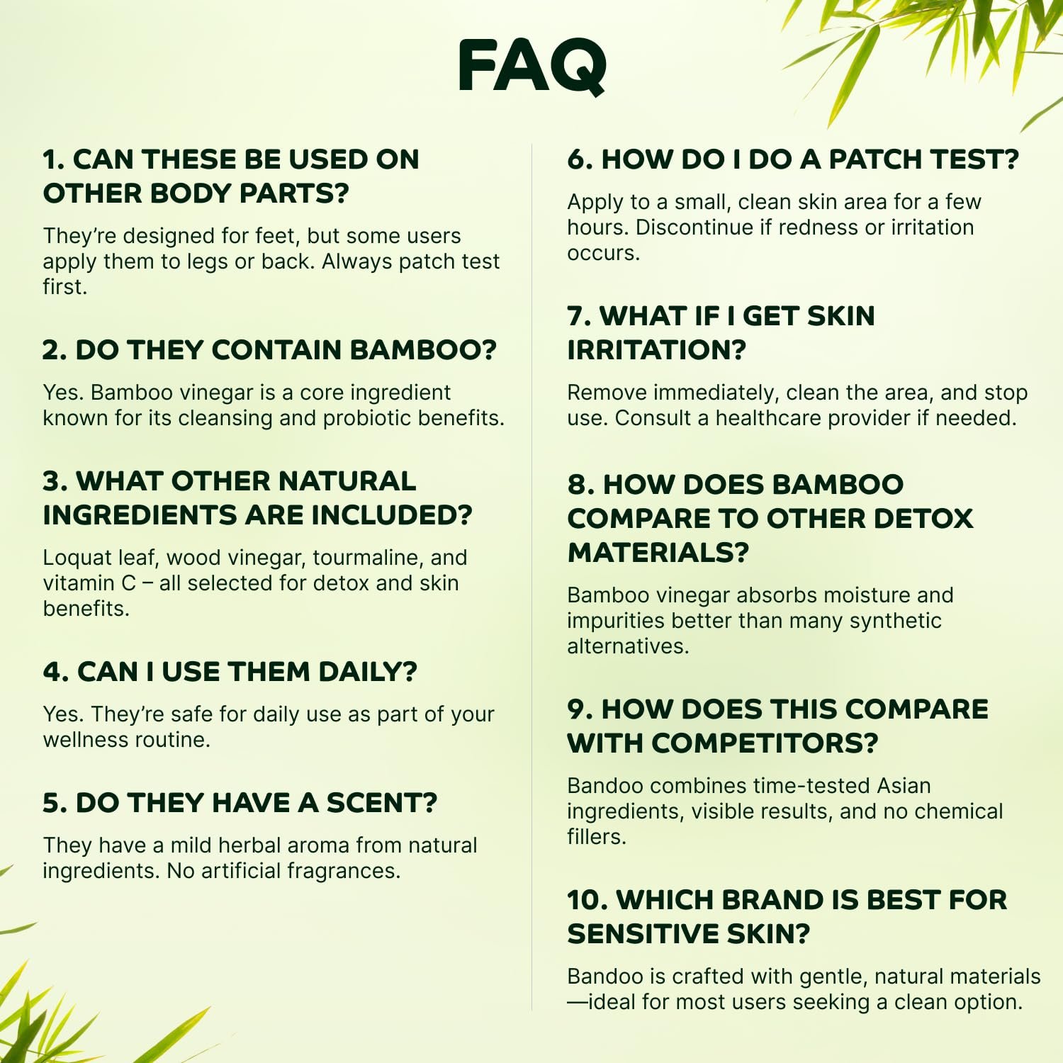 For optimal results, we recommend wearing the pads overnight while you sleep. This allows the ingredients to work most effectively. How often should I use Bandoo Pads? For best results, we recommend using Bandoo Cleansing Foot Pads every night. However, the frequency can be adjusted based on your personal needs and the advice of your healthcare provider. Can I use Bandoo Cleansing Foot Pads on other parts of my body? While Bandoo Cleansing Foot Pads are designed for use on the soles of the feet, some users have found them effective when used on other parts of the body. However, we recommend consulting with a healthcare provider before applying them to other areas Will I see immediate results with Bandoo Cleansing Foot Pads? The effects of Bandoo Cleansing Foot Pads can vary from person to person. Some users may notice immediate results, while others may need to use the pads consistently over a period of time to see changes. Can I use Cleansing Foot Pads during the day? Yes, you can use Bandoo Cleansing Foot Pads during the day, but for optimal results, we recommend using them overnight while you sleep.