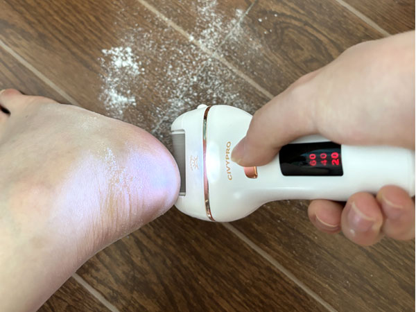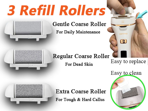 STEP2: STEP3: Choose a refill roller according to your foot skin condition, switch the button on and gently glide the roller on your skin. Clean your feet, soak them for about 10min and then dry your feet with a cloth. Apply moisturizing lotion. Enjoy happy feet!