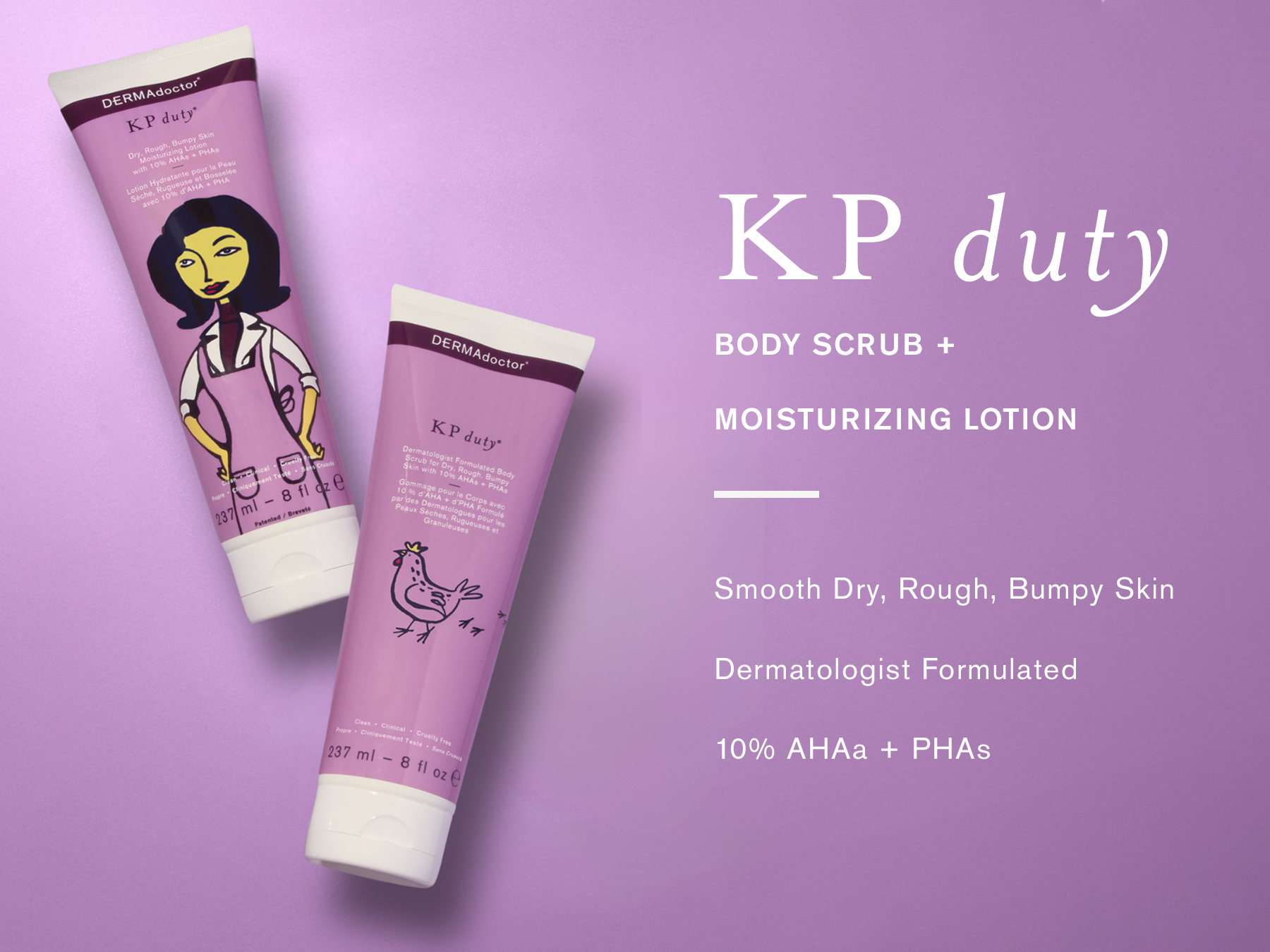 Experience the power of KP Duty Lotion and Body Scrub in one convenient kit. Unveil silky smooth skin by combining AHAs, PHAs, and botanicals for the ultimate skin-nourishing experience.