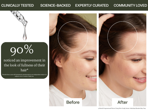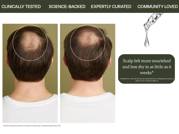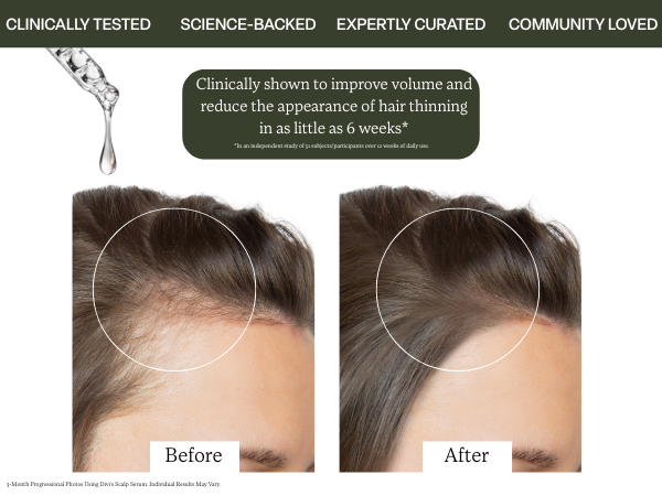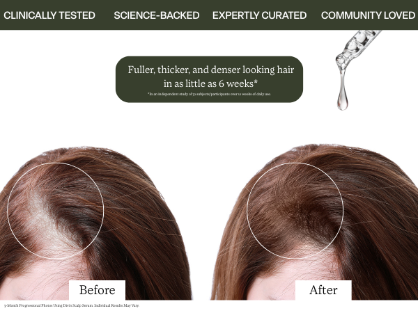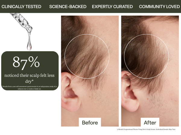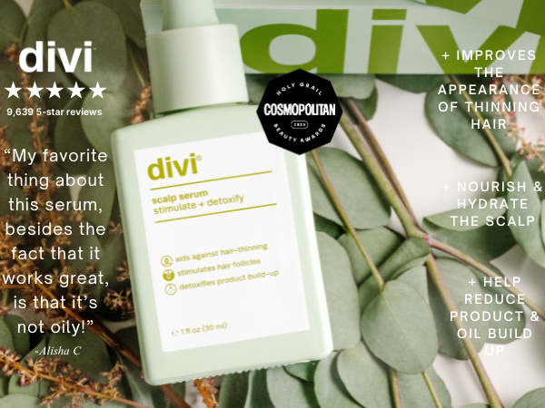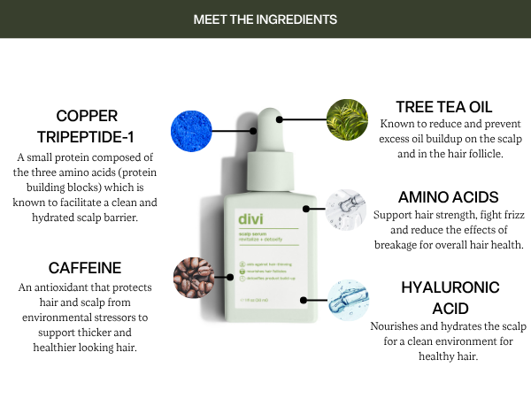 We recommend using Divi’s Scalp Serum daily for 3 continuous months to see best results. That said, you may experience benefits after just a few uses including a happy scalp, more hydration and less product buildup. Why am I not getting the tingly feeling? Some users have more sensitive scalps than others. You’ll get the same benefits from our scalp serum with or without the tingly feeling. Tingling may feel stronger when applied right after showering to clean, damp hair. Are there any side effects? If you notice any unusual symptoms, stop using the product immediately and consult your doctor. Can I use styling/heat products with Divi’s Scalp Serum? Yes! Our Scalp Serum is designed to fit into your normal hair maintenance and styling routine. Is Divi’s Scalp Serum right for me? Our Scalp serum is good for those with itchy, dry scalps, those with hair shedding/thinning, scalps with a lot of product or oil buildup, those who wear tight hairstyles, those with extensions, and anyone looking to start a cleansing scalp routine.