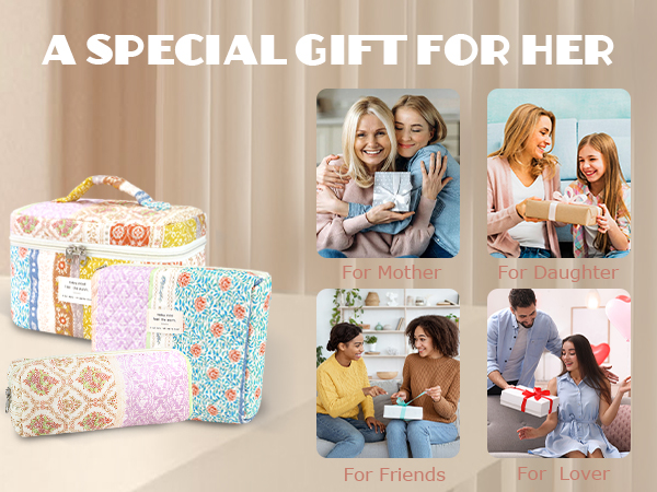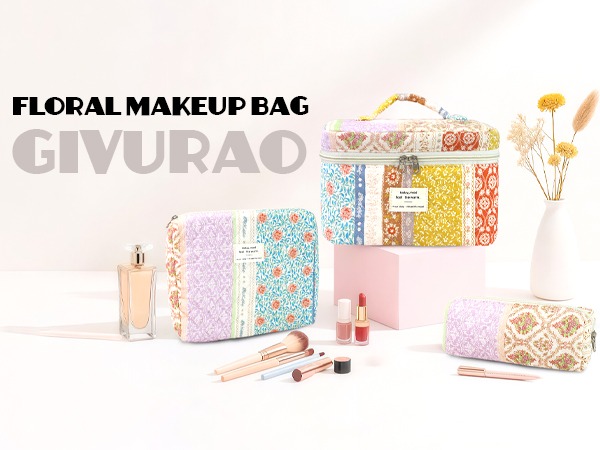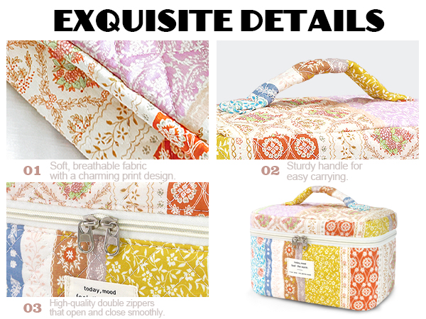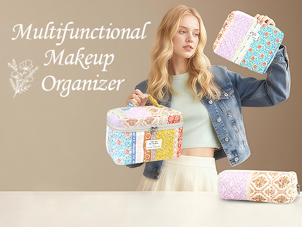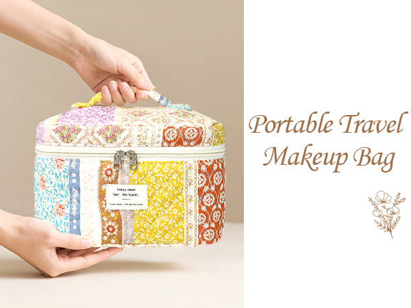 Unique floral patterns ideal for organizing makeup, toiletries, and skincare. Premium quilted cotton, durable and soft to the touch. Spacious design holds all cosmetics and toiletries. Convenient for travel. Washable and available in multiple colors. Perfect gift option for special occasions.