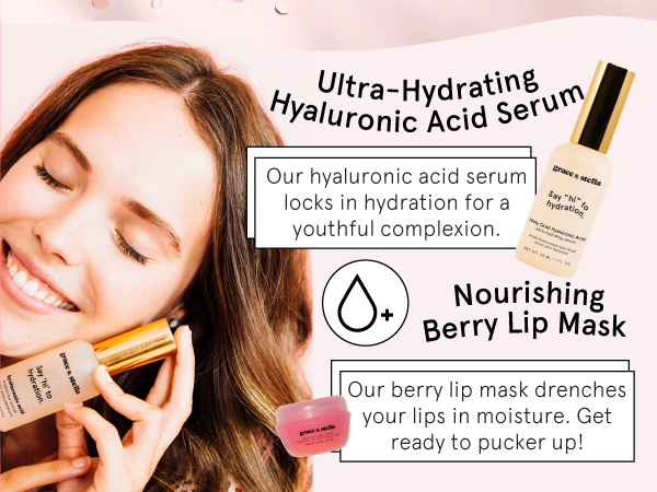 - Hydration Savior: Our HA face serum and rose water keep skin soft and supple, leaving your lips luscious with the berry lip mask.