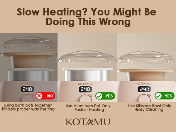 Confusing it might seem to be, this is absolutely NORMAL. The KOTAMU wax pot is designated to heat all the way up so as to FULLY melt the wax beads and later IT’LL BRING ITSELF BACK TO THE TEMP YOU SET IT TO. Can’t it just heat up to the temp I want and then sit on it? Superb advice! Our product engineering team has been craving for a better user experience and your voice def will be heard. Currently, the machine still needs to go for a highest temp for fast, even melting of waxes. So how long will it take for the whole process? For the melting it takes about 10 minutes to reach 240° or so; then another 10 to 15 mins to cool to the temp you set. You’ll see the indicator light switches from red to GREEN when the desired temperature is reached. I’m a total newbie. Is there anything I should be aware of beforehand? You bet. One simple but often ignored tip for waxing is: you can always rely on the consistency of the wax much more than the machine’s thermometer. Scroll down to Product guides and documents, download the detailed PDF instruction book for MORE. I am not happy with my purchase. What should I do? Let’s get in touch on Amazon any time you need help! Your experience with KOTAMU matters a lot to us so any thought/opinion/feedback you would like to share with us would be most welcome!
