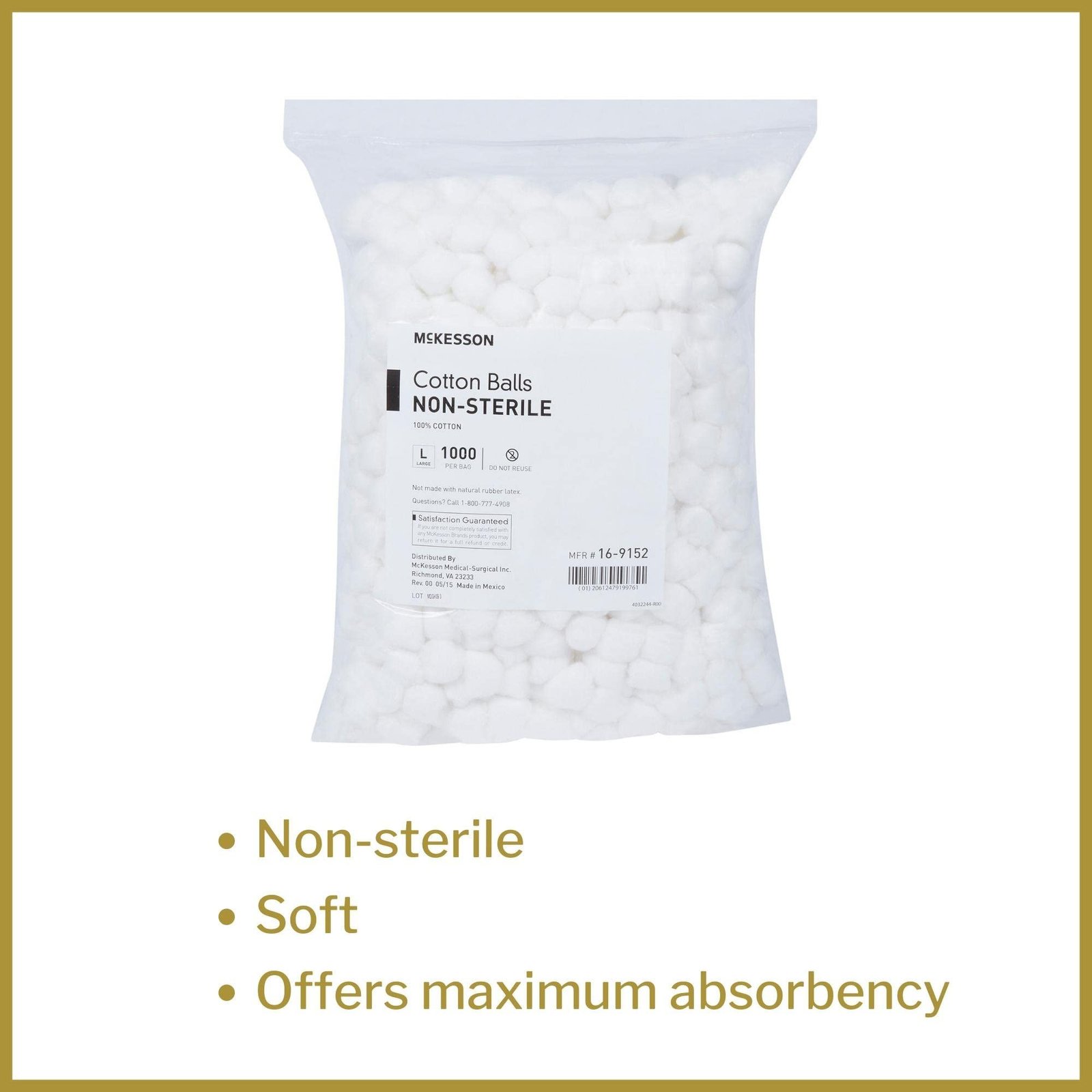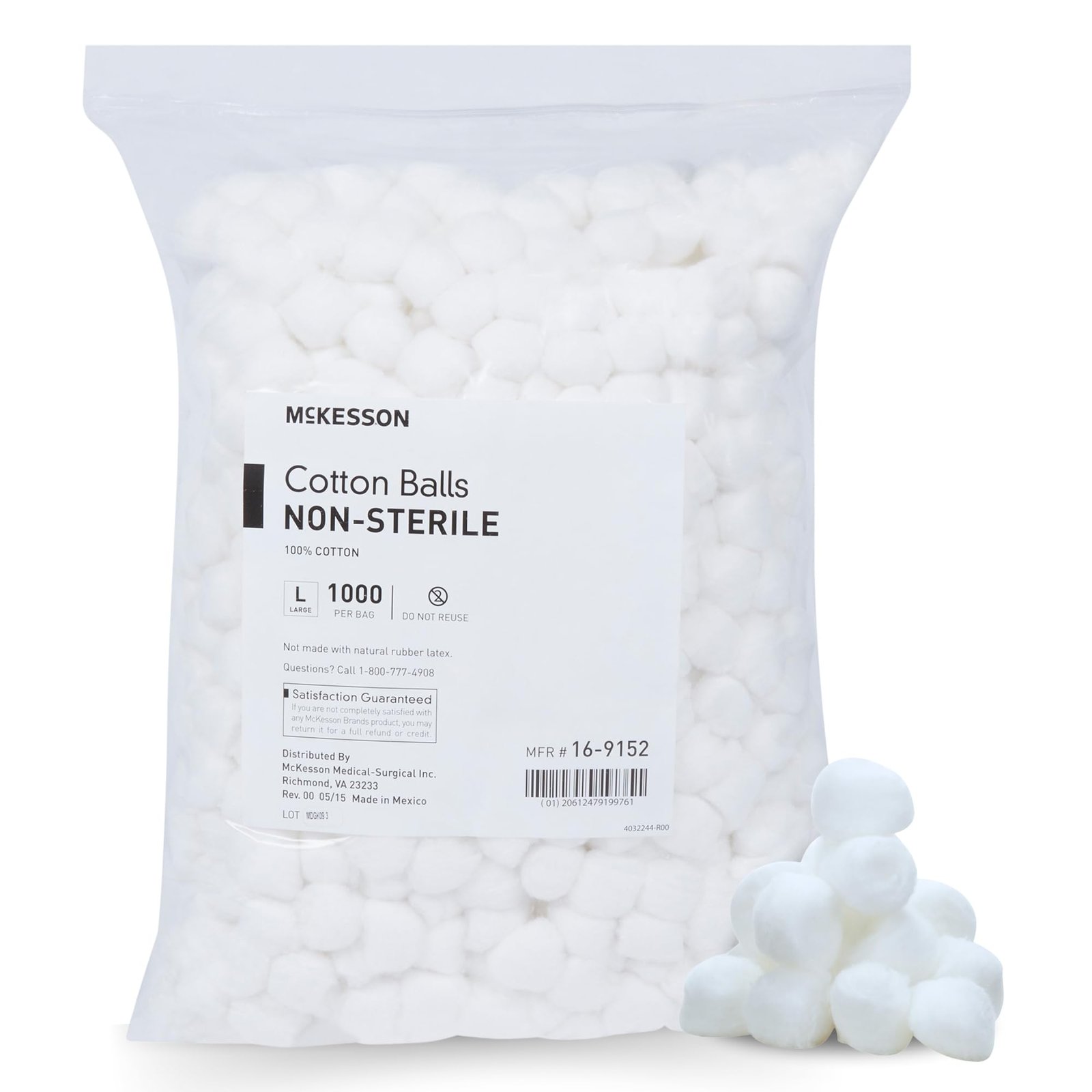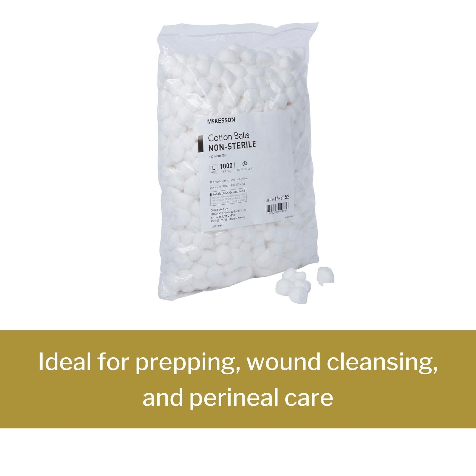McKesson Non-Sterile Cotton Balls are made of 100-percent cotton that is soft to the touch while offering optimal absorbency for wound care. These large or medium-sized, single-use cotton balls are non-sterile and retain their shape wet or dry, making them an ideal choice for minor wound cleaning and applying creams and ointments. At a Glance: Large or medium cotton balls made from 100% cotton Ideal for wound cleansing and applying first aid creams and ointments Soft and absorbent cotton balls retain their shape wet or dry Explore a comprehensive selection of McKesson wound care products that help save money without compromising quality