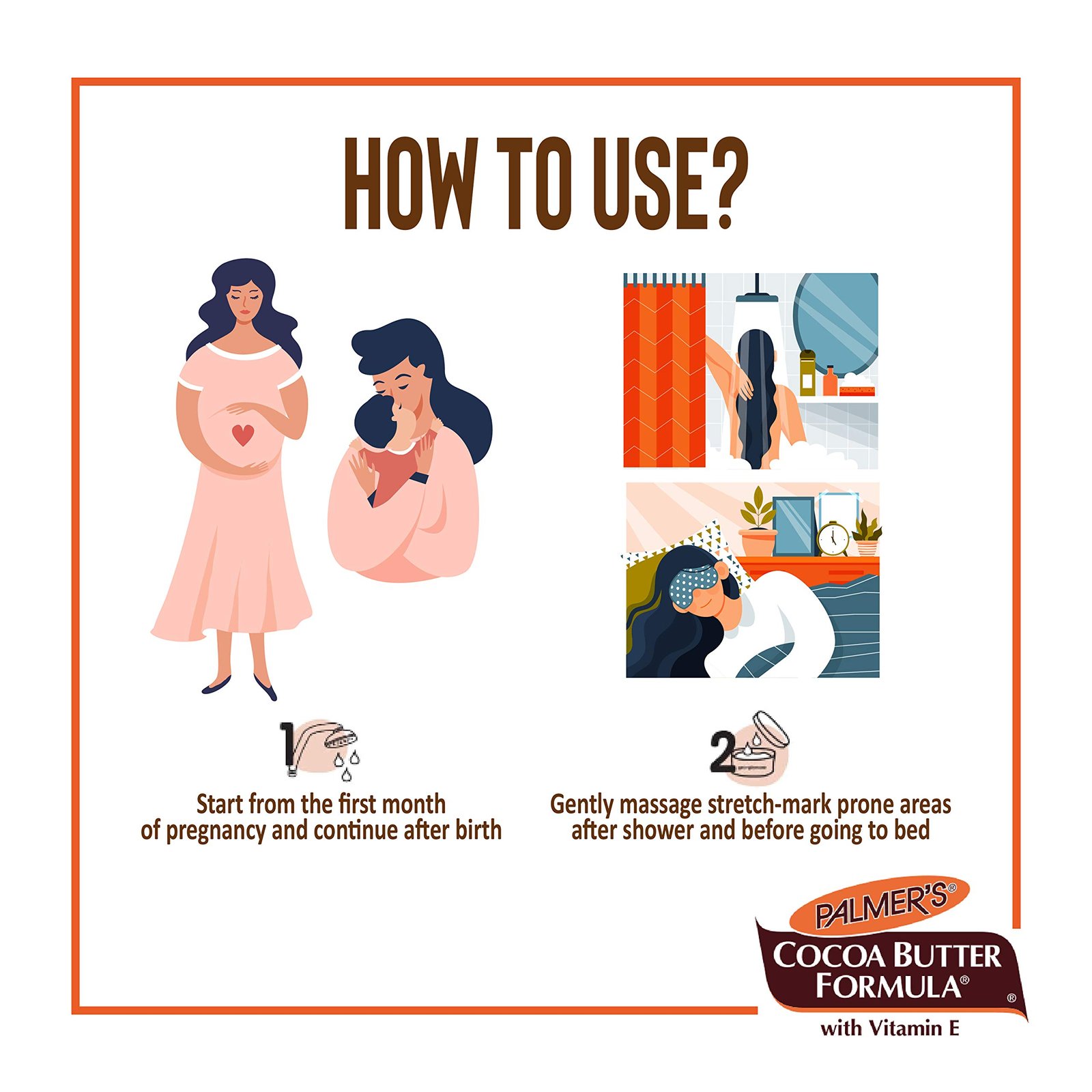 Nine out of ten pregnant women develop stretch marks during pregnancy. Palmer’s Massage Cream helps improve skin elasticity and reduce stretch marks with Pure Cocoa Butter, Shea Butter, and essential oils. This non-greasy formula is perfect for all-over body use.
