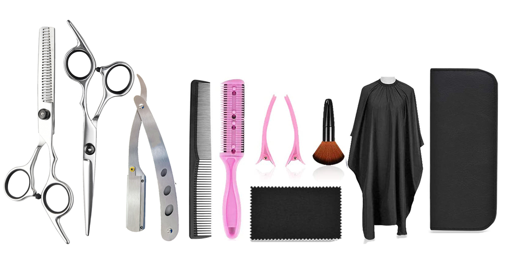 1 x Hair Scissors,1 x Thinning Shear,1 x Hair Razor Comb, 1 x Straight Edge Razor (Blade Included), 1 x Cleaning Cloth, 1 x Comb, 2 x Hairpin , 1 x Barber Cape, 1 x Neck Duster, 1 x Leather Bag. The kit meets all your hair cutting and styling needs. - Feature: High Quality Stainless Steel