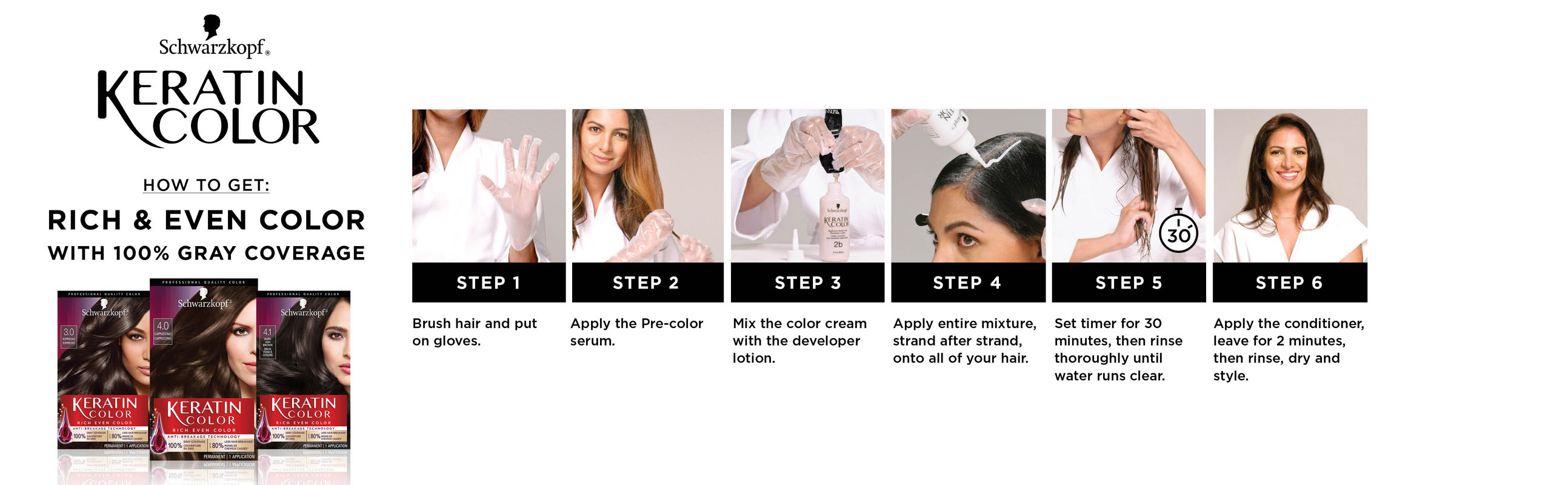If you have less than 30% gray, choose 1 shade lighter. Apply the Pre-Color Serum to your lengths before coloring for an even result. For extra care benefits, leave the conditioner on for up to 15 min, covered with a shower cap. For hair longer than shoulder length, use two bottles of Keratin Color for application.