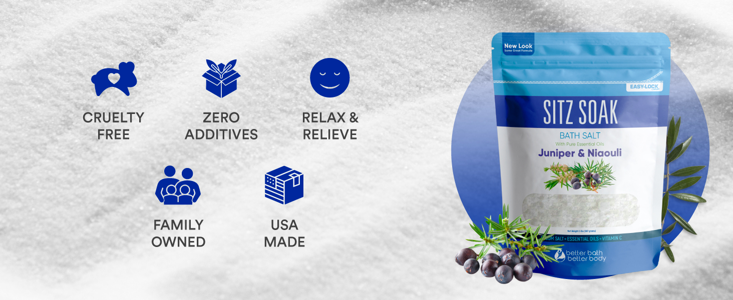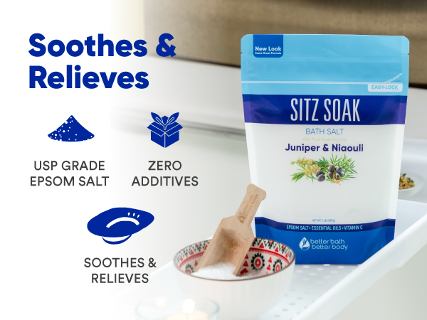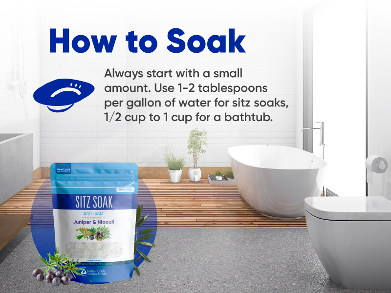 Better Bath Better Body Sitz Soak Bath Salt 2-Lbs (32 Oz) Better Bath Better Body offers relaxing blends of epsom salt and pure essential oils for soothing soaks. How To Use: Always start with a small amount for your first use. For sitz soaks, use 1-2 tablespoons per gallon of water. Enjoy the soothing and relieving benefits of epsom salt.