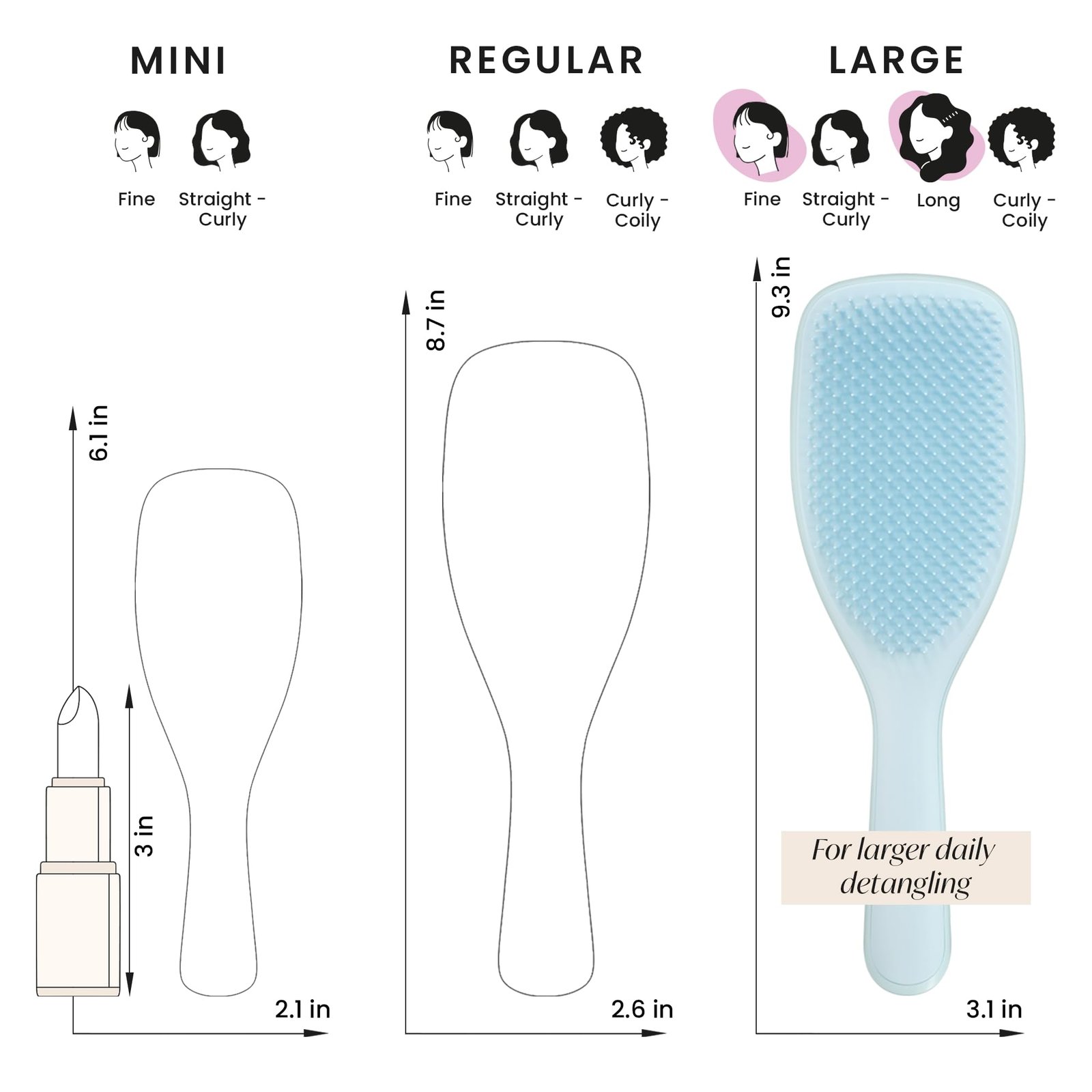 Large Ultimate Detangler with various teeth options for different hair types. Mini size available for portability.