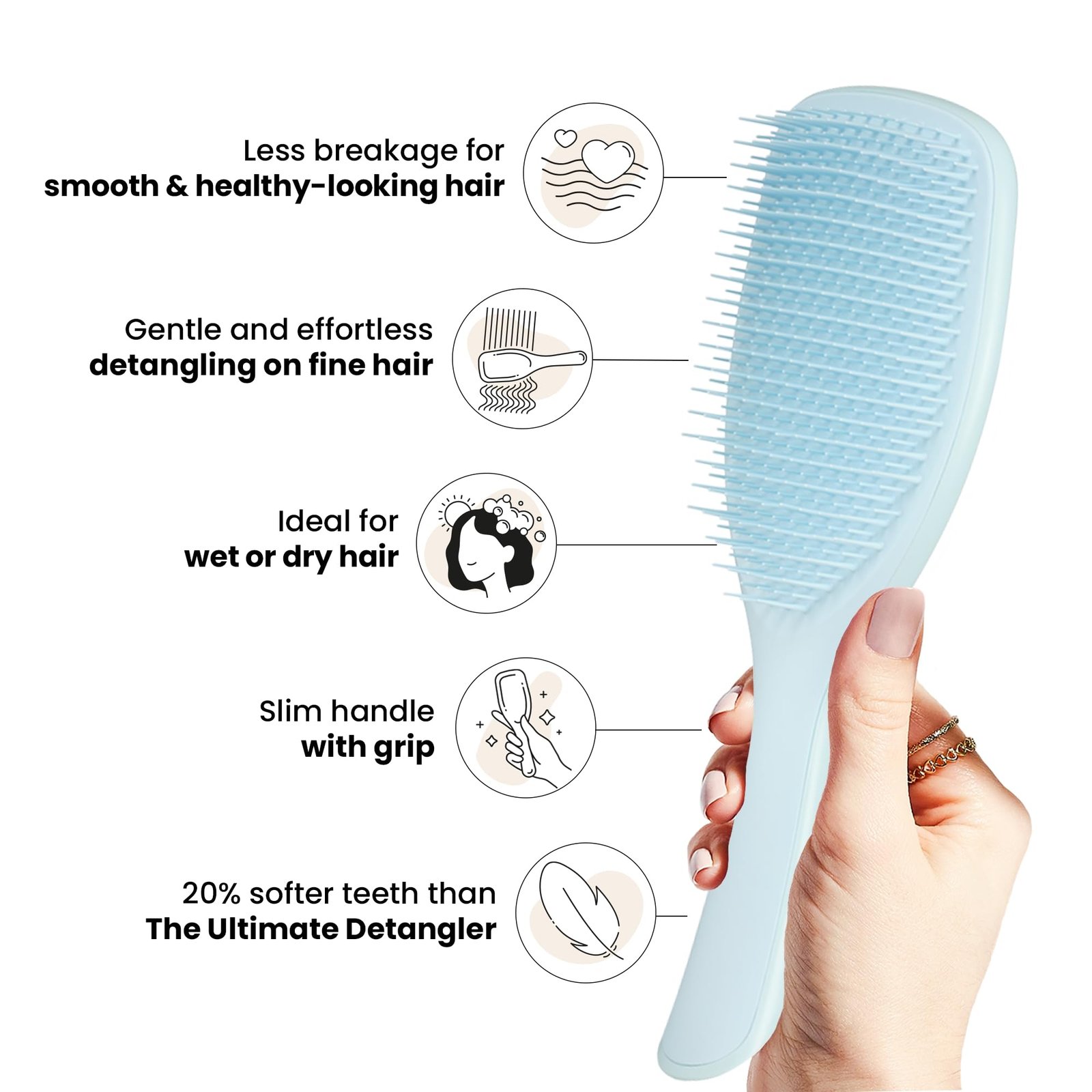 - Soft-Flex Teeth: Delicately detangles fine, fragile hair