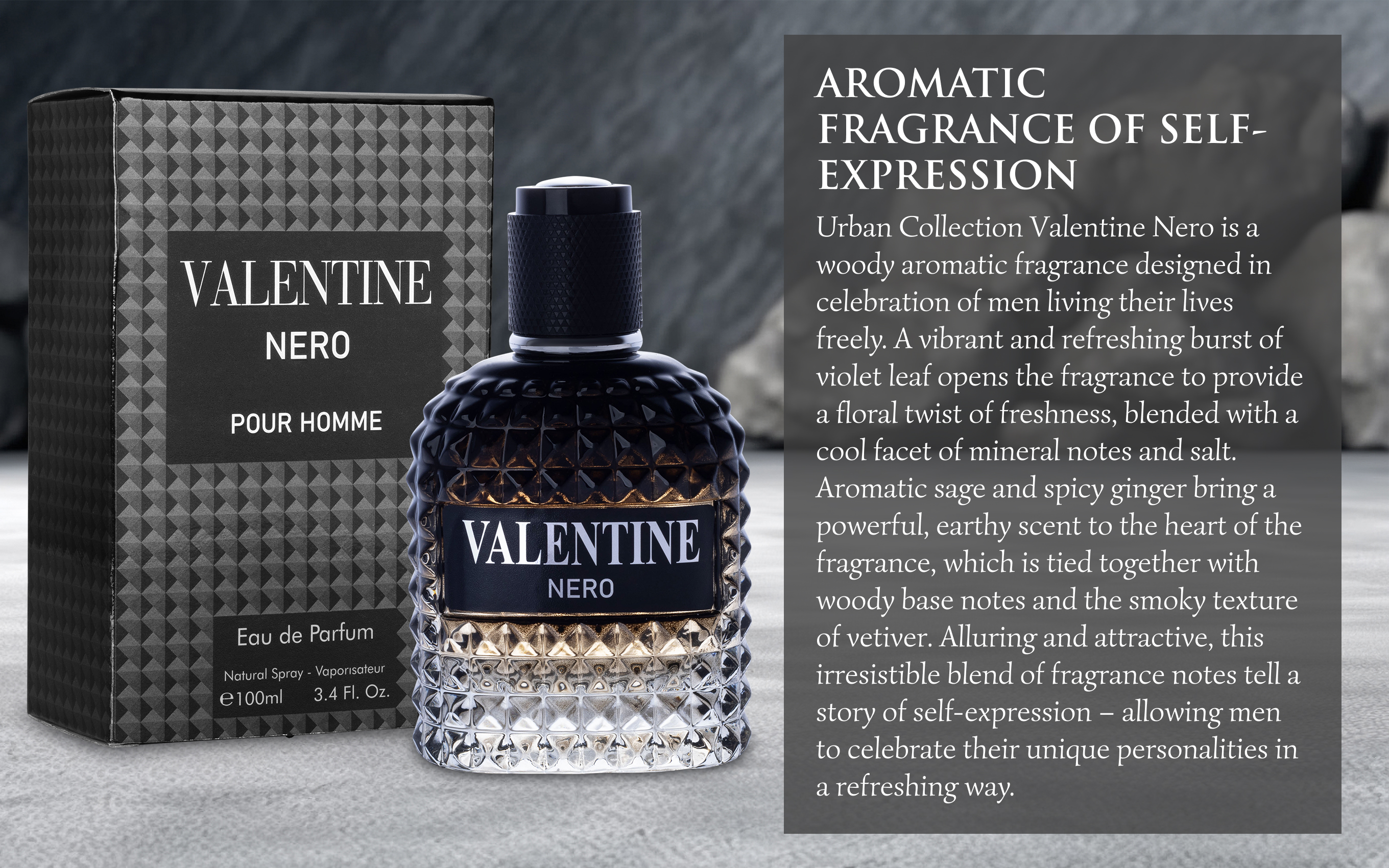 Urban Collection Valentine Nero is a woody aromatic fragrance celebrating men’s freedom. With floral, mineral, and spicy notes, it tells a story of self-expression and uniqueness. This scent embodies individuality and freshness, perfect for the modern man.