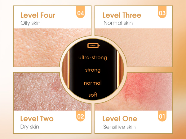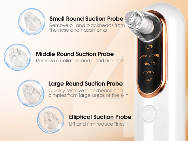 Suitable for all skin types. One-button control for appropriate suction levels. Highly effective for deep skin cleansing, blackheads, whiteheads, acne, and more. Includes replacement probes for various skin areas. 4 suction levels adjustable for different skin types, protecting delicate skin.